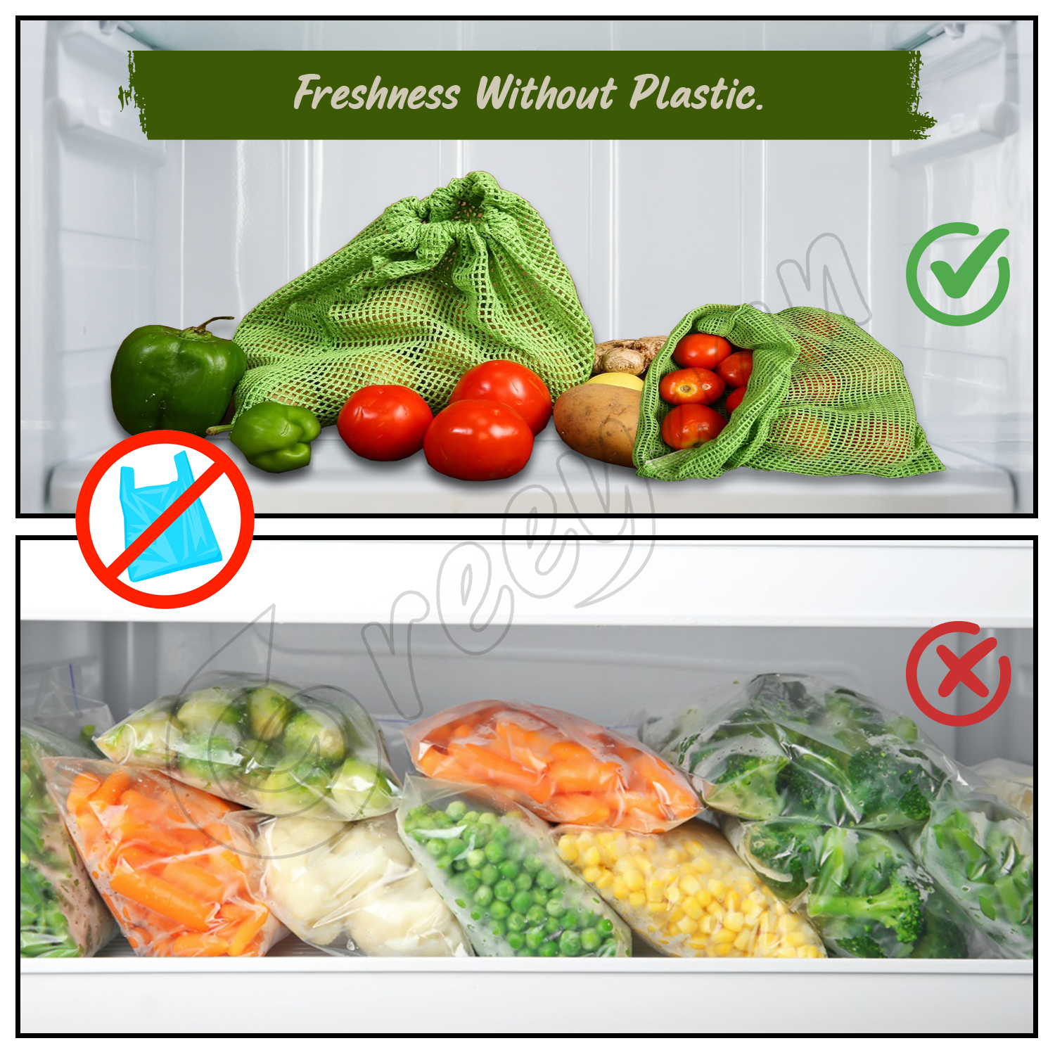 - ECO-FRIENDLY & REUSABLE – Say goodbye to plastic bags! These premium cotton eco friendly vegetable bag for fridge are sustainable, biodegradable, and safe for daily use. Designed with a sturdy drawstring, they can be reused hundreds of times while keeping their shape and quality.